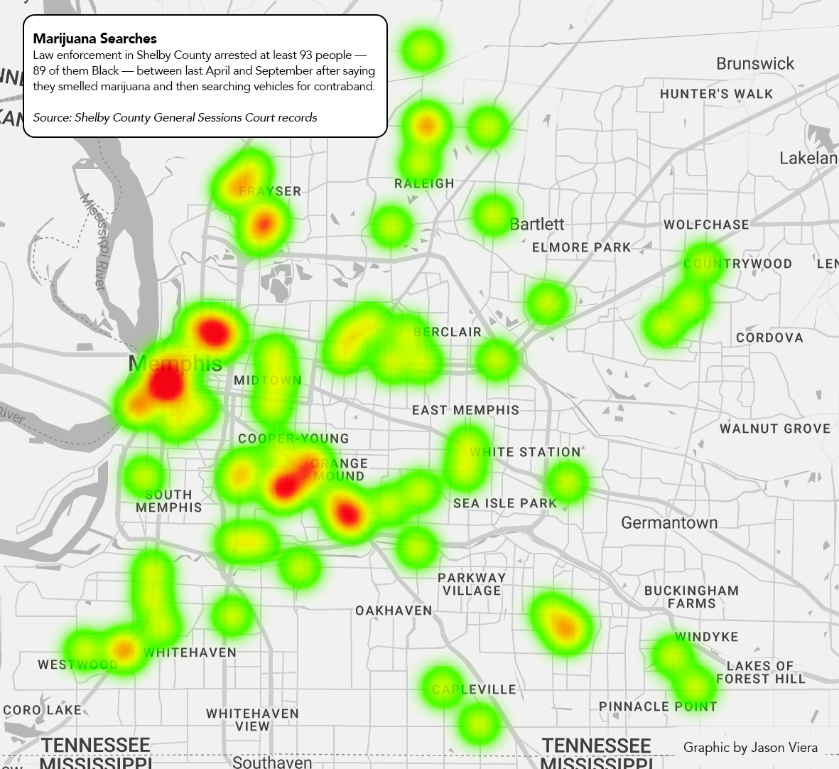 Overall, African-Americans represented 89 of 93 Shelby County defendants (96 percent) identified by The Institute as having been arrested between last April and September after officers said they smelled marijuana. Many of the traffic stops, which often led to charges unconnected to marijuana possession, were clustered in African-American neighborhoods in Orange Mound, Frayser, Hickory Hill and South and North Memphis.