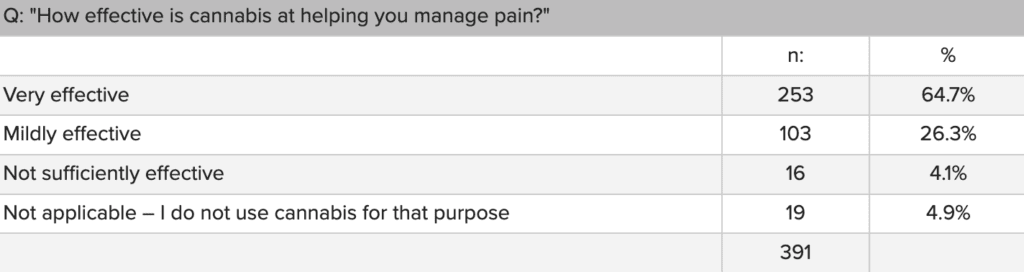 That includes about 65 percent who said it is “very effective” and 26 percent who said it’s “mildly effective” in pain management. Only four percent of respondents said marijuana it “not sufficiently effective” for chronic pain.
