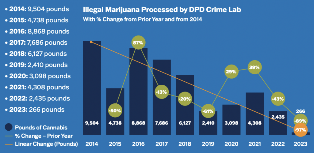 Meanwhile, illicit cannabis activity has steadily declined as the city’s market has evolved, with marijuana-related offenses representing just 0.2 percent of crimes last year. Law enforcement seizures of illicit marijuana feel from 2,435 pounds in 2022 to 266 pounds last year. And that’s down from 9,504 pounds back in 2014 when legal sales launched.