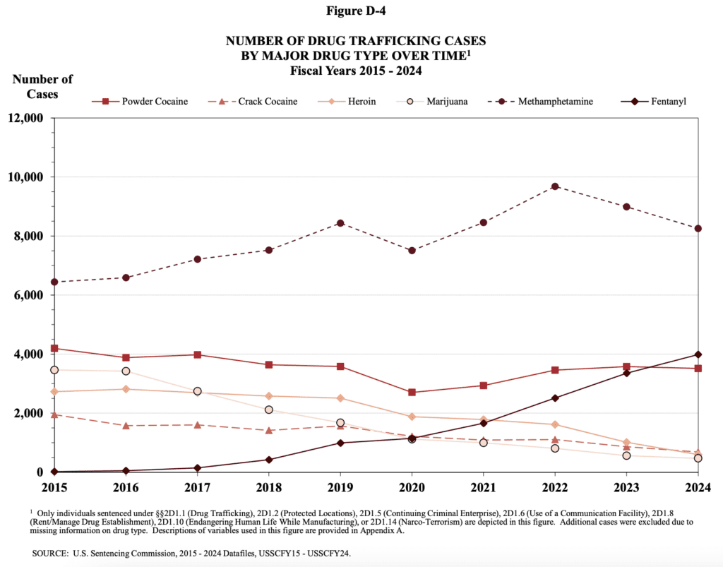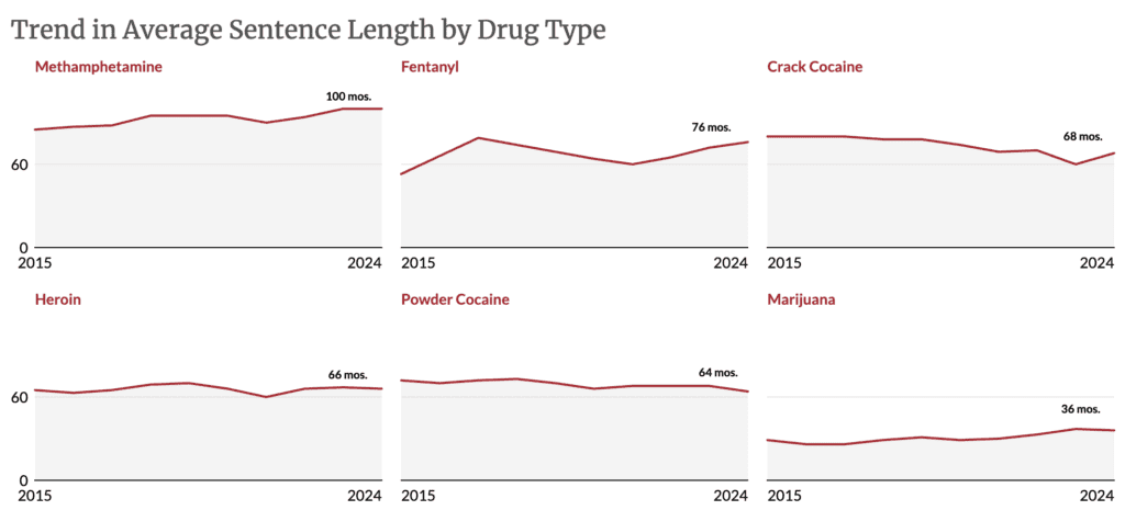 “The average length of drug trafficking sentences decreased for three of the six major drug types: powder cocaine, heroin, and marijuana,” the report says. “The average sentence for fentanyl and crack cocaine offenses increased in 2024, while the average sentence for methamphetamine was unchanged.”