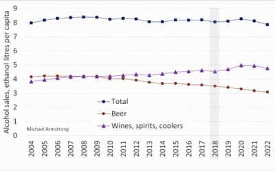 Annual Canadian beverage alcohol sales from 2004 to 2022, in litres of ethanol content per capita. The vertical gray bar marks cannabis legalization. (Statistics Canada), CC BY-ND