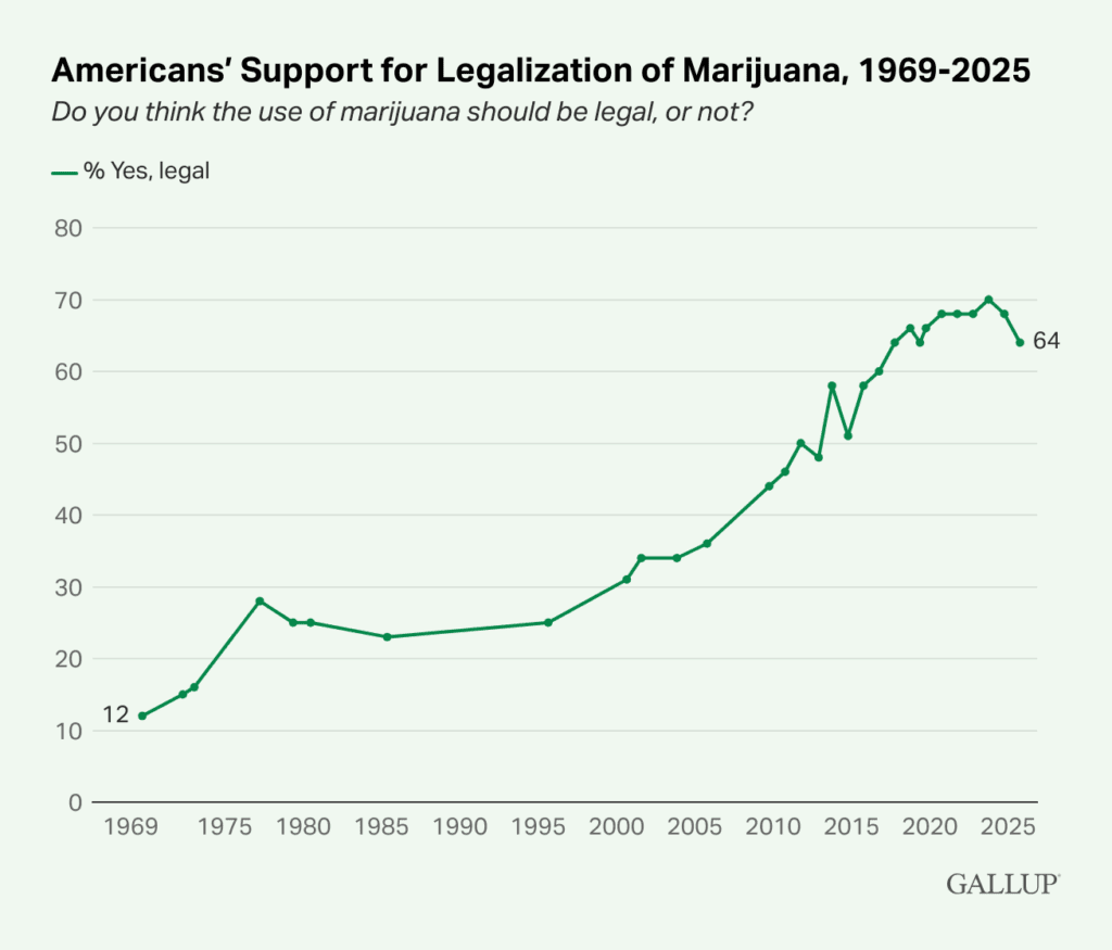 Overall, 64 percent of Americans now back ending cannabis prohibition. That’s 4 percentage points lower than Gallup’s 2024 results.