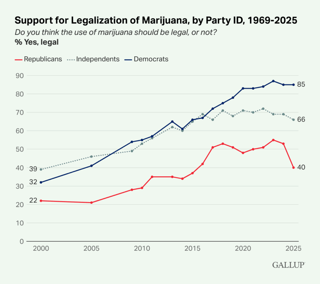 Over the past year, Republican support for legalization fell 13 percentage points—down to 40 percent—which is “the lowest level of support for legalization among this group in a decade,” Gallup said on Wednesday.