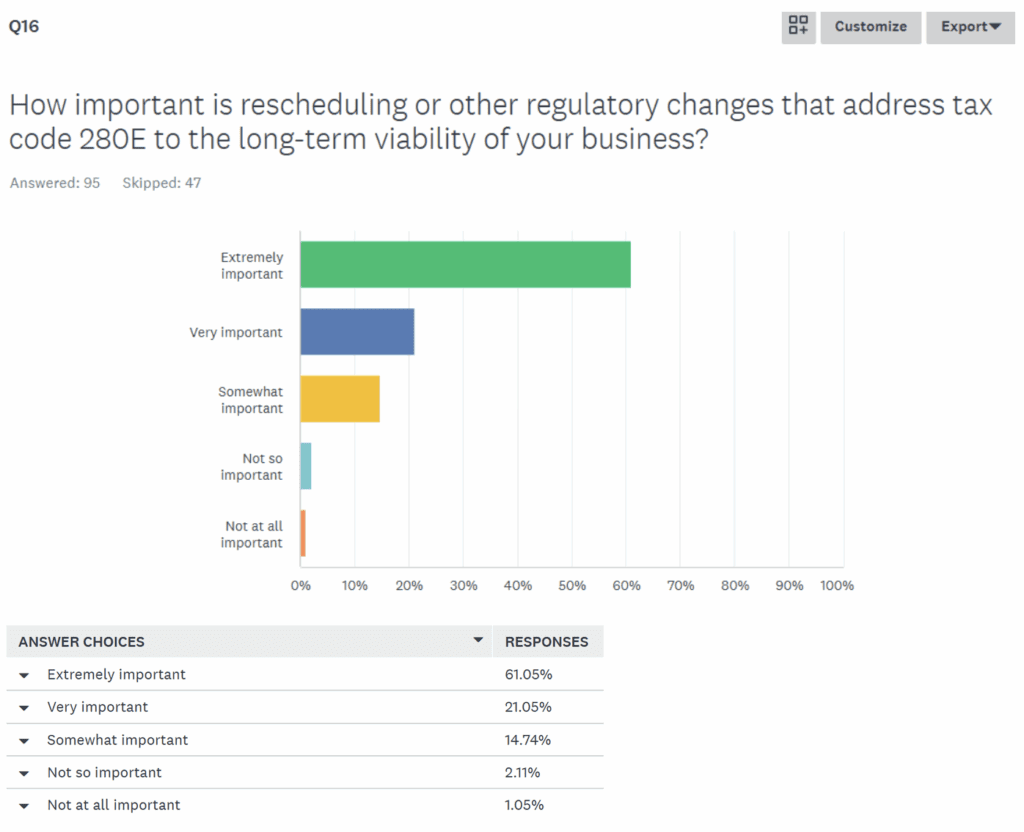 That’s in spite of the fact that the vast majority of respondents (about 97 percent) said that rescheduling—and the resulting federal tax relief—say the reforms are “important” to the “long-term viability” of their businesses.