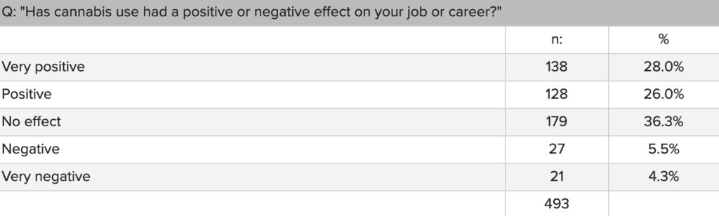 Fifty-four percent of respondents said their marijuana consumption led to positive developments in their careers, including 28 percent who described it as “very positive.”